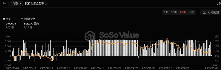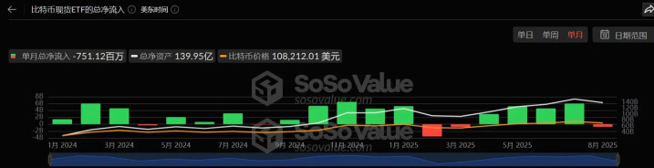 股价与币价的背离,并非 Metaplanet 一家的个股噪音(小编在《从错位到同跌:币股联动走到十字路口》一文中已有详述),也不是一句“基本面变差”能解释的,关键在于加密内生变量走弱——据 SoSoValue,8月比特币现货ETF单月净流出约7.51亿美元;比特币资金费率自7月中旬高位回落至接近0、期间多次转负。边际买盘降温、杠杆动能走弱,BTC 财库股与 BTC 的再耦合门槛被抬高。