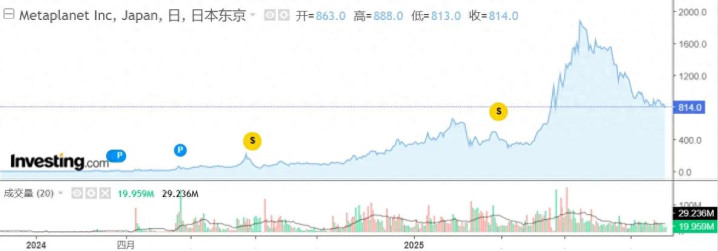 截至9月2日收盘(UTC+9),Metaplanet 报832日元,较6月高点1,930日元回撤约57%。按持币2万枚、以 BTC 约10.8–11.1万美元计,财库市值约21.6–22.2亿美元,对应“市值/持币市值”≈ 1.8×(近似 mNAV 溢价,未计其他资产/负债)。